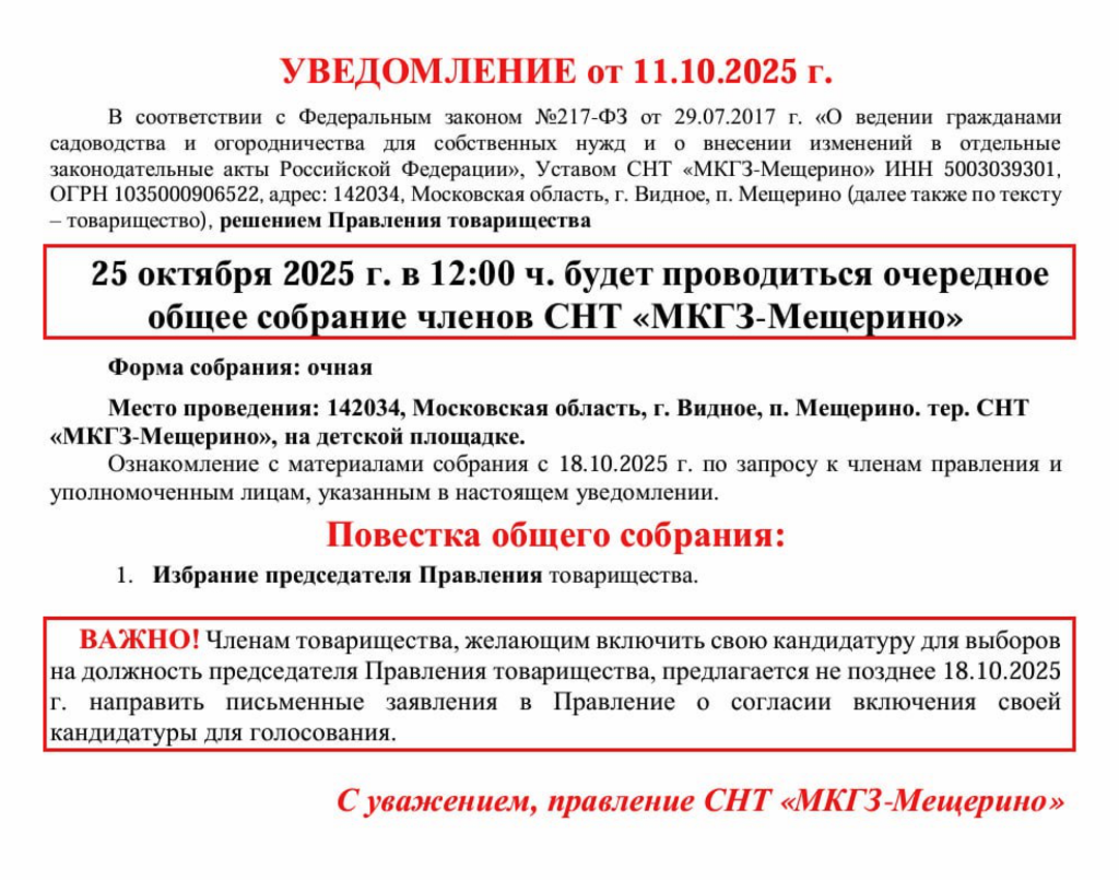 25 октября 2025 г. в 12:00 ч. будет проводиться очередное общее собрание членов СНТ «МКГЗ-Мещерино»